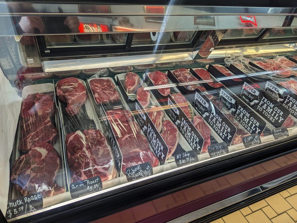 - Choice cuts of all popular steaks/ Ribeye, New York Strips, Sirloin, Round Steak, Minute Steaks, Fillets, Chuck, Arm and Rump Roast, Pork Tenderloins, Boneless and Bone In Pork Chops, Pork Roasts, Boneless and Bone In Pork Butts